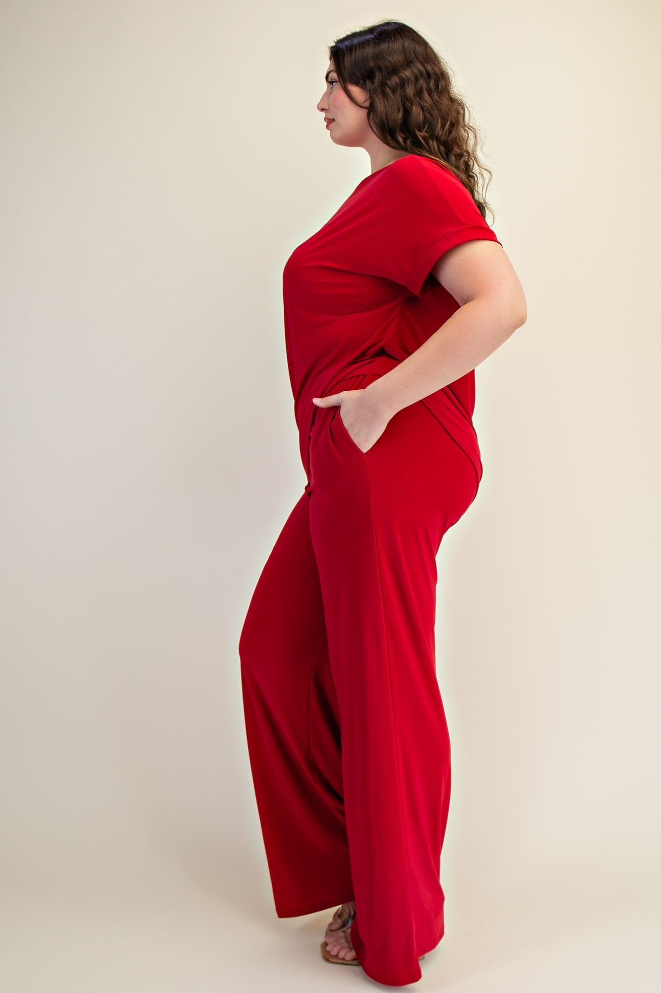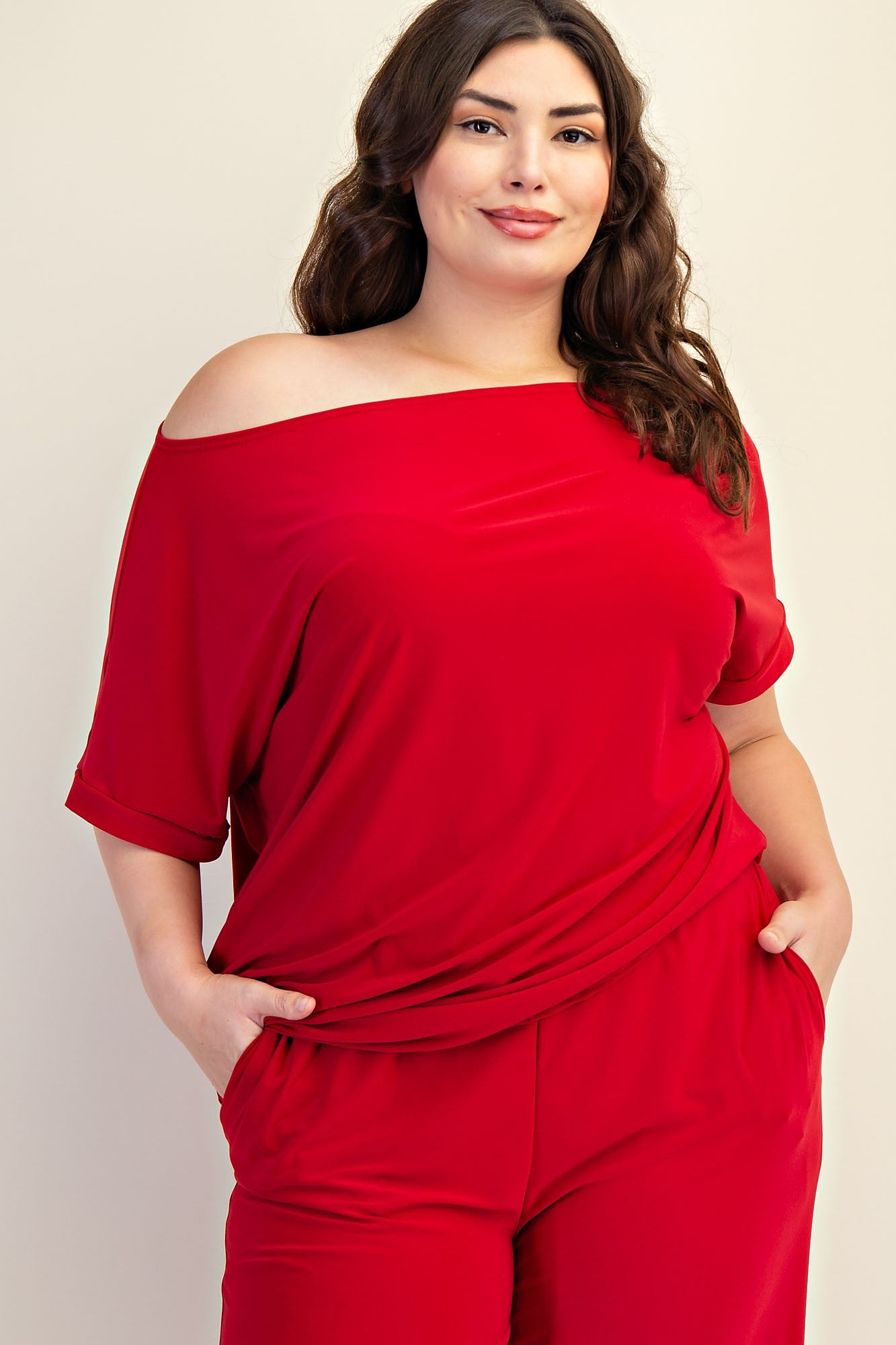 Step into effortless elegance with the Crimson Grace Set. This knit two-piece features a wide off-shoulder boat neckline, short dolman sleeves, and matching wide-leg pants with an elasticized high-rise waist. Perfect for brunch, vacation vibes, or a night out, this set balances chic style with all-day comfort.